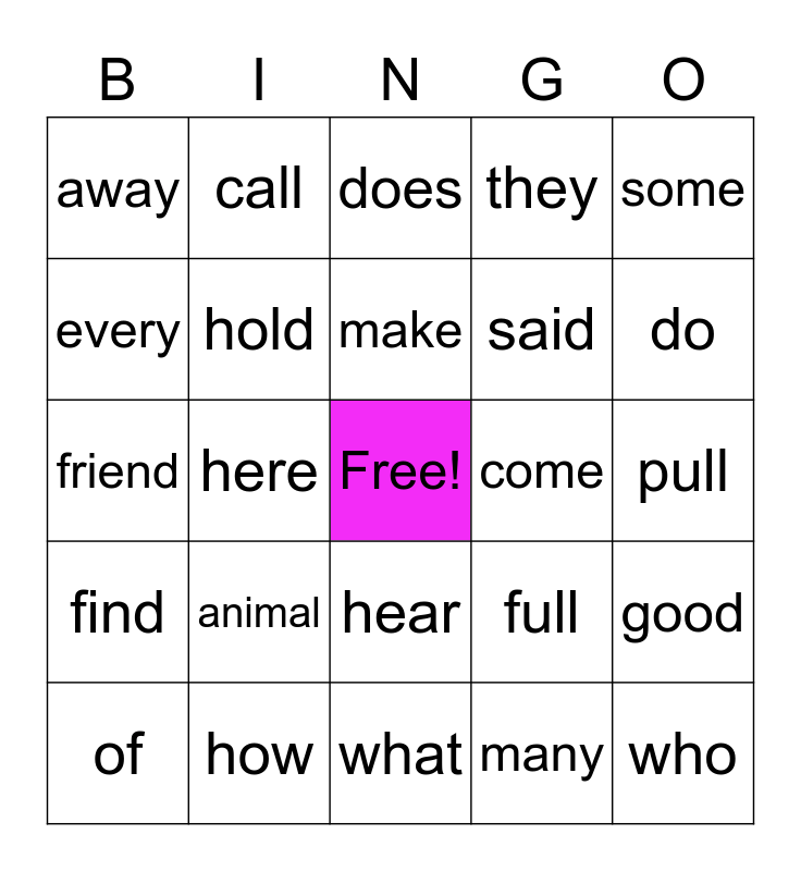 This bingo card has a free space and 24 words: animal, how, make, of, some, away, every, call, come, hear, said, friend, full, good, hold, many, pull, does, do, here, who, find, they and what.