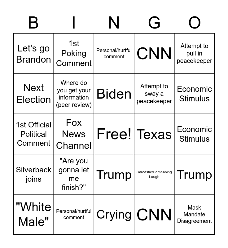 ⚠ This card has duplicate items: 1st Poking Comment (2), 1st Official Political Comment (2), Let's go Brandon (2), Personal/hurtful comment (2), Trump (2), Biden (2), Crying (2), Fox News Channel (2), CNN (2), Economic Stimulus (2), Texas (2), "Are you gonna let me finish?" (2)
