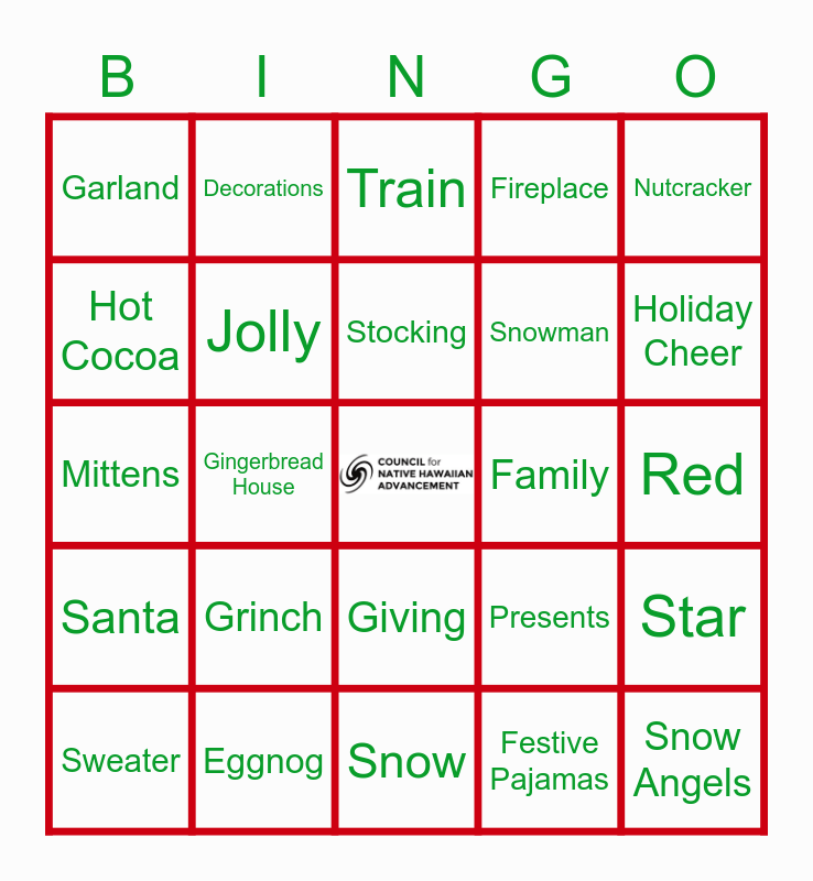 This bingo card has a free space and 48 words: Joy, Snow Angels, North Pole, Snow, Grinch, Tree, Decorations, Holiday Lights, Hot Cocoa, Candy Canes, Jolly, Fireplace, Star, Presents, Mistletoe, Elves, Stocking, Family, Caroling, Nutcracker, Gingerbread House, Festive Pajamas, Garland, Snowman, Ornament, Holiday Cheer, Sweater, Noel, Giving, Santa, Reindeer, Sleigh, Celebrate, Chimney, Eggnog, Sugar, Cookies, Red, Green, Silver, Gold, Snowflake, Train, Cold, Mittens, Jingle Bell, Holly and Wreath.