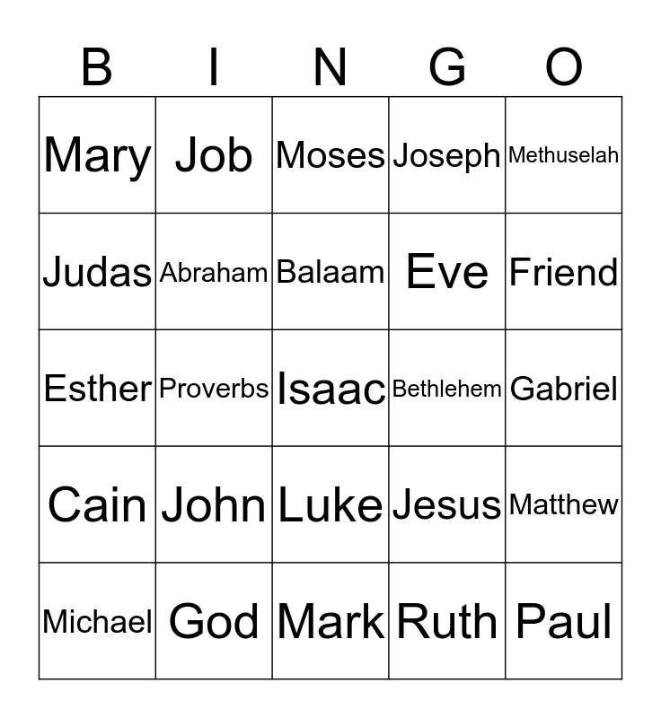 This bingo card has 25 words: John, Mark, Balaam, Michael, Methuselah, Mary, Judas, Job, Bethlehem, Luke, Eve, Esther, Jesus, Matthew, Abraham, Paul, Gabriel, Moses, Friend, Proverbs, Isaac, God, Cain, Joseph and Ruth.