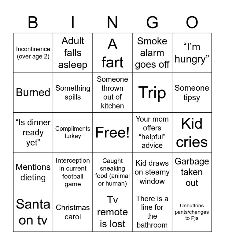 This bingo card has a free space and 29 words: Santa on tv, Racist comment, Compliments turkey, Time out given (non sports), Incontinence (over age 2), A fart, Something spills, Interception in current football game, Your mom offers “helpful” advice, Christmas carol, Kid cries, Unbuttons pants/changes to Pjs, Tv remote is lost, There is a line for the bathroom, Someone tipsy, “Dad joke”, Caught sneaking food (animal or human), Mentions dieting, “I’m hungry”, “Is dinner ready yet”, Kid draws on steamy window, Something breaks, Trip, Burned, Smoke alarm goes off, Adult falls asleep, Garbage taken out, Someone thrown out of kitchen and Profanity.