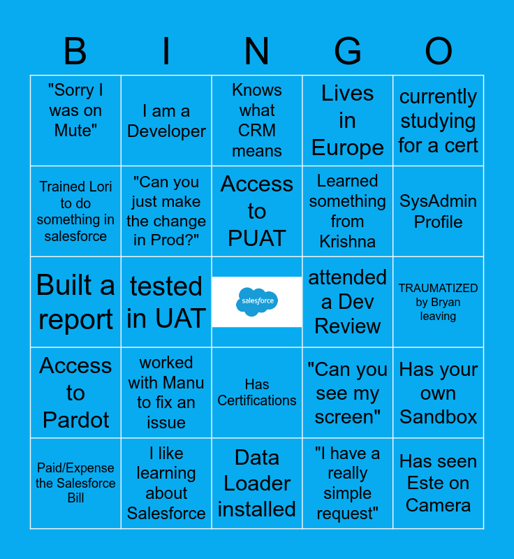 This bingo card has a free space and 39 words: Owns Salesforce Merch, Had a call with Lori that ran too long, Completed a Trailhead, "Can you just make the change in Prod?", Paid/Expense the Salesforce Bill, Has Certifications, Access to PUAT, Updates to JIRA board, currently studying for a cert, Access to Pardot, tested in UAT, Lives in Europe, Has seen Este on Camera, TRAUMATIZED by Bryan leaving, attended a Dev Review, worked with Manu to fix an issue, heard a crying baby on our call, "Sorry I was on Mute", STILL traumatized by Bryan's departure, "Can you see my screen", Trained Lori to do something in salesforce, Data Loader installed, Learned something from Krishna, SysAdmin Profile, Lives in the US, Has seen Krishna on Camera, Has seen Mandeep on Camera, 5+ Certs, Attended dreamforce or World Tour, I am a Developer, Has used Bypass Settings, Has been yelled at by Este, Knows what CRM means, I like learning about Salesforce, "I have a really simple request", "import everything, we'll clean the data later", Has your own Sandbox, Built a report and tested for seasonal release.