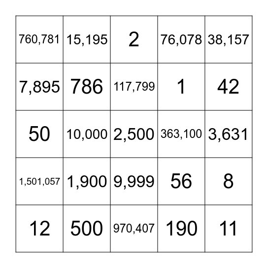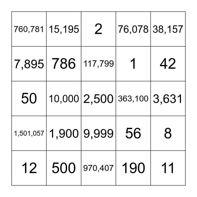 This bingo card has 73 words: 3,815,167, 441,347, 760,781, 97,407, 1,177,699, 78,195, 1,501,057, 715,375, 56, 79, 11, 2,005, 786, 3,631, 9,042, 15,195, 970,407, 7,895, 44,134, 363,100, 117,799, 76,078, 38,157, 7,860, 12, 99, 400, 160, 40, 1,600, 500, 5,000, 100, 1,000, 10,000, 70, 700, 250, 2,500, 25,000, 190, 1,900, 19,000, 4, 3, 1, 2, 15, 20, 50, 55, 76, 98, 118, 9,740, 150,105, 111, 9,999, 18, 28, 27, 48, 63, 42, 32, 45, 72, 40, 8, 9, 6, 7 and 5.