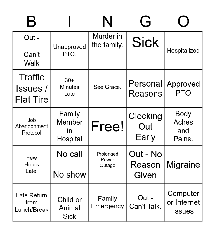 This bingo card has a free space and 24 words: No call No show, Child or Animal Sick, See Grace., Late Return from Lunch/Break, Hospitalized, Out - Can't Walk, Traffic Issues / Flat Tire, Unapproved PTO., Clocking Out Early, Prolonged Power Outage, Personal Reasons, Job Abandonment Protocol, Out - No Reason Given, Migraine, 30+ Minutes Late, Out - Can't Talk., Body Aches and Pains., Murder in the family., Approved PTO, Family Member in Hospital, Computer or Internet Issues, Few Hours Late., Sick and Family Emergency.