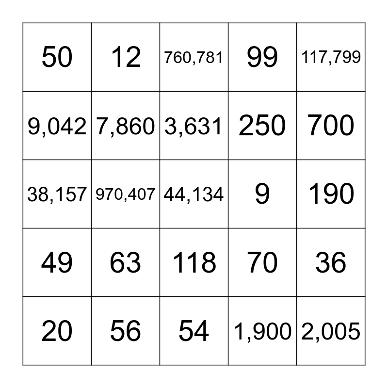 This bingo card has 77 words: 3,815,167, 441,347, 760,781, 97,407, 1,177,699, 78,195, 1,501,057, 715,375, 79, 11, 2,005, 786, 3,631, 9,042, 15,195, 970,407, 7,895, 44,134, 363,100, 117,799, 76,078, 38,157, 7,860, 12, 99, 400, 160, 1,600, 500, 5,000, 100, 1,000, 10,000, 70, 700, 250, 2,500, 25,000, 190, 1,900, 19,000, 4, 3, 1, 2, 15, 20, 50, 55, 76, 98, 118, 9,740, 150,105, 111, 9,999, 18, 28, 27, 48, 63, 42, 32, 45, 72, 40, 8, 9, 6, 7, 5, 36, 49, 56, 21, 54 and 64.