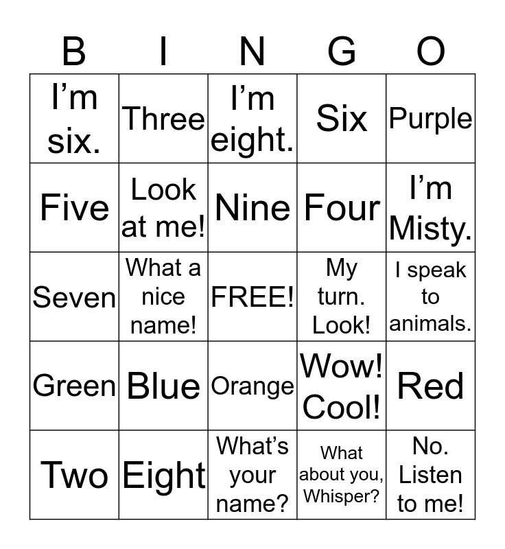This bingo card has a free space and 31 words: What’s your name?, Hi, I’m Whisper., What a nice name!, How old are you?, I’m six., I’m eight., Look at me!, Wow! Cool!, My turn. Look!, What about you, Whisper?, I speak to animals., No. Listen to me!, I’m Thunder., I’m Flash., I’m Misty., Yellow, Red, Blue, Green, Orange, Purple, One, Two, Three, Four, Five, Six, Seven, Eight, Nine and Ten.