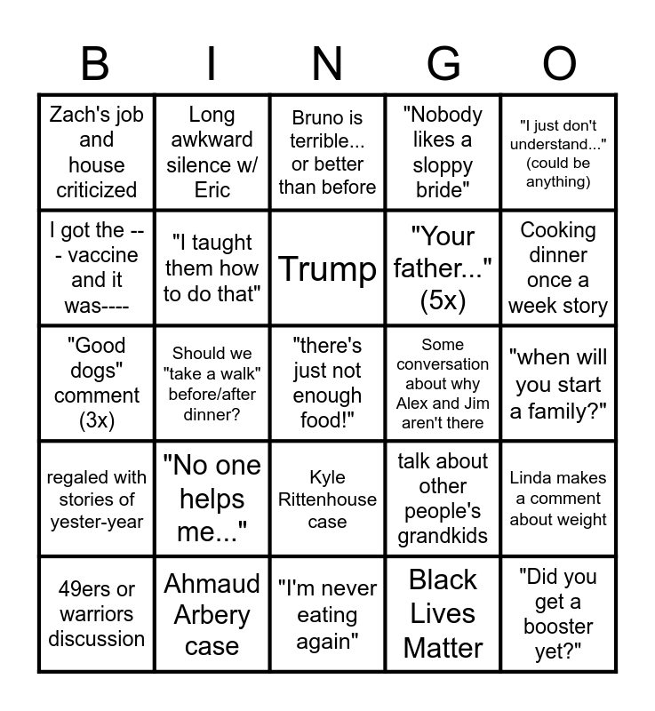 This bingo card has a free space and 24 words: "No one helps me...", Ahmaud Arbery case, Trump, 49ers or warriors discussion, "I just don't understand..." (could be anything), Zach's job and house criticized, I got the --- vaccine and it was----, Long awkward silence w/ Eric, Some conversation about why Alex and Jim aren't there, Kyle Rittenhouse case, "Your father..."(5x), "Good dogs" comment (3x), talk about other people's grandkids, Linda makes a comment about weight, "I taught them how to do that", Black Lives Matter, "when will you start a family?", Bruno is terrible... or better than before, Cooking dinner once a week story, Should we "take a walk" before/after dinner?, "Did you get a booster yet?", regaled with stories of yester-year, "Nobody likes a sloppy bride" and "I'm never eating again".