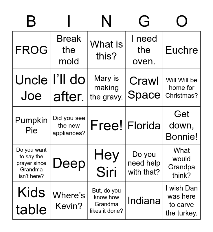 This bingo card has a free space and 25 words: Deep, But, do you know how Grandma likes it done?, Mary is making the gravy., Kids table, Euchre, FROG, Uncle Joe, Break the mold, Florida, Hey Siri, Crawl Space, Pumpkin Pie, Do you need help with that?, What would Grandpa think?, I’ll do after., What’s the spread?, Get down, Bonnie!, What is this?, Will Will be home for Christmas?, Did you see the new appliances?, I wish Dan was here to carve the turkey., Where’s Kevin?, Do you want to say the prayer since Grandma isn’t here?, I need the oven. and Indiana.