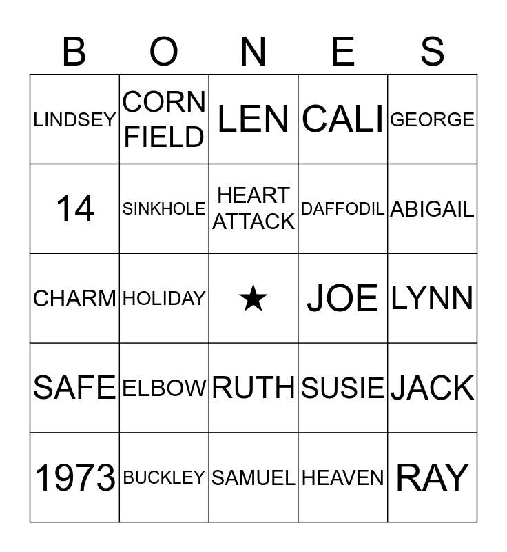 This bingo card has a free space and 24 words: ELBOW, BUCKLEY, HEART ATTACK, 1973, GEORGE, LINDSEY, 14, CORN FIELD, JOE, RUTH, DAFFODIL, CHARM, SUSIE, JACK, SINKHOLE, HEAVEN, LYNN, LEN, ABIGAIL, HOLIDAY, RAY, SAFE, CALI and SAMUEL.