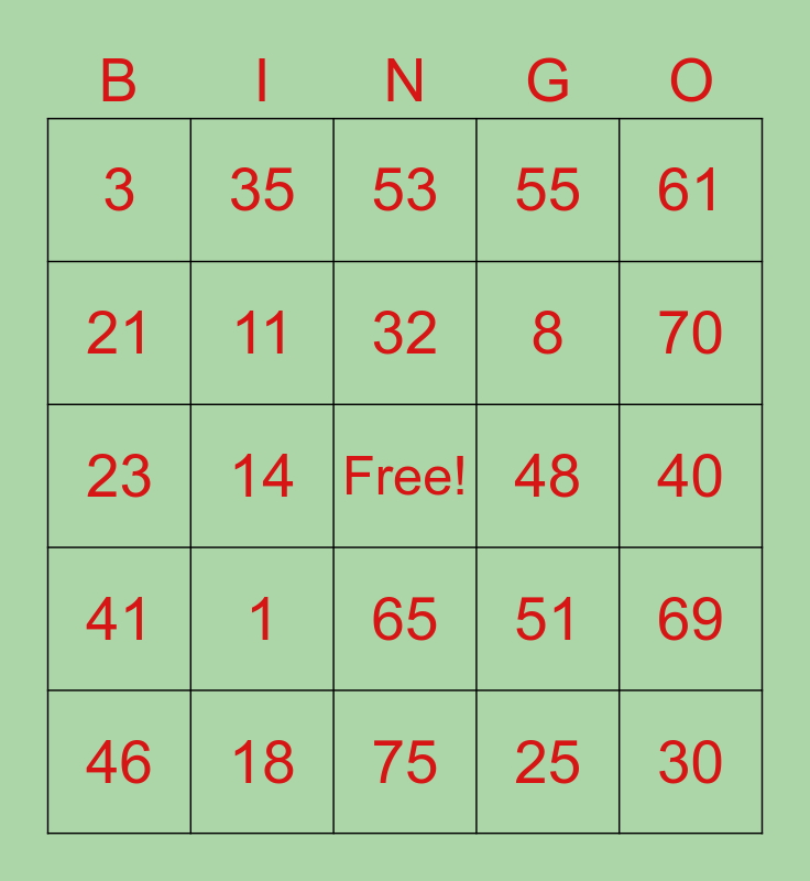 This bingo card has a free space and 24 words: 1, 18, 32, 46, 61, 3, 21, 35, 48, 65, 8, 23, 51, 69, 11, 25, 40, 53, 70, 14, 30, 41, 55 and 75.