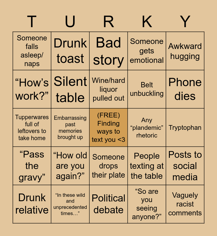 This bingo card has a free space and 24 words: Drunk relative, “How old are you again?”, Wine/hard liquor pulled out, “So are you seeing anyone?”, Awkward hugging, Someone falls asleep/ naps, Drunk toast, Bad story, Any “plandemic” rhetoric, Tryptophan, Tupperwares full of leftovers to take home, Silent table, People texting at the table, Posts to social media, “How’s work?”, “In these wild and unprecedented times…”, Political debate, Someone gets emotional, Phone dies, “Pass the gravy”, Embarrassing past memories brought up, Someone drops their plate, Belt unbuckling and Vaguely racist comments.
