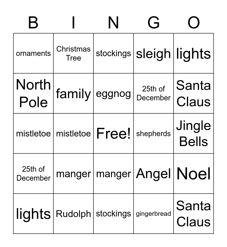 ⚠ This card has duplicate items: Merry Christmas (2), Santa Claus (2), Elves (2), stockings (2), manger (2), Jesus (2), Christmas Tree (2), wreath (2), North Pole (2), Rudolph (2), family (2), sleigh (2), Noel (2), Angel (2), Jingle Bells (2), Silent Night (2), eggnog (2), shepherds (2), candy canes (2), lights (2), mistletoe (2), gingerbread (2), ornaments (2), 25th of December (2), Nativity (2)