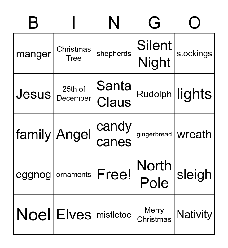 This bingo card has 26 words: Free!, Merry Christmas, Santa Claus, Elves, stockings, manger, Jesus, Christmas Tree, wreath, North Pole, Rudolph, family, sleigh, Noel, Angel, Jingle Bells, Silent Night, eggnog, shepherds, candy canes, lights, mistletoe, gingerbread, ornaments, 25th of December and Nativity.
