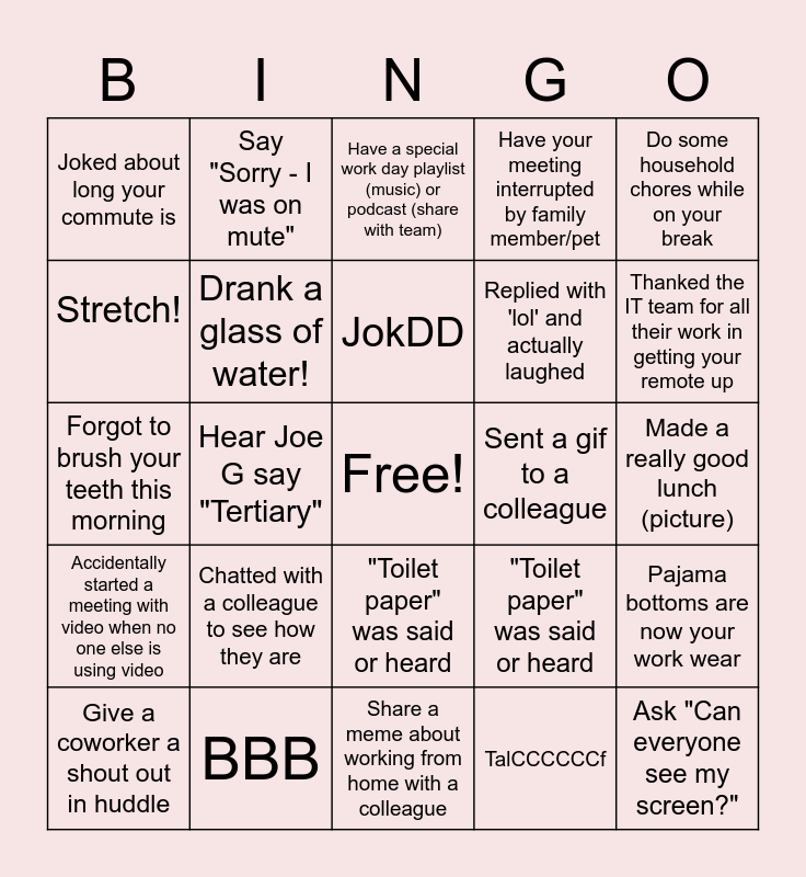 This bingo card has a free space and 27 words: SAAA, BBB, JokDD, TalCCCCCCf, Do some household chores while on your break, Stretch!, Say "Sorry - I was on mute", Share a meme about working from home with a colleague, Sent a gif to a colleague, Pajama bottoms are now your work wear, Accidentally started a meeting with video when no one else is using video, Drank a glass of water!, "Toilet paper" was said or heard, Ask "Can everyone see my screen?", Forgot to brush your teeth this morning, Made a really good breakfast (picture), Have a special work day playlist (music) or podcast (share with team), Have your meeting interrupted by family member/pet, Made a really good lunch (picture), Joked about long your commute is, Chatted with a colleague to see how they are, "Toilet paper" was said or heard, Replied with 'lol' and actually laughed, Thanked the IT team for all their work in getting your remote up, Give a coworker a shout out in huddle, Hear Joe G say "Tertiary" and Did over 10,000 steps today..