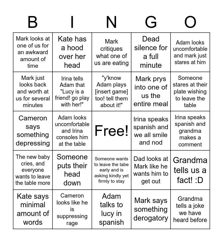 This bingo card has a free space and 24 words: Someone puts their head down, Cameron looks like he is suppressing rage, "y'know Adam plays [insert game] too! tell them about it!", Kate says minimal amount of words, Adam looks uncomfortable and mark just stares at him, Mark looks at one of us for an awkward amount of time, Mark just looks back and worth at us for several minutes, Kate has a hood over her head, Irina speaks spanish and we all smile and nod, Someone wants to leave the tabe early and is asking kindly yet firmly to stay, Mark prys into one of us the entire meal, Cameron says something depressing, Dad looks at Mark like he wants him to get out, Grandma tells us a fact! :D, Irina tells Adam that "Lucy is a friend! go play with her!", Mark says something derogatory, Irina speaks spanish and grandma makes a comment, Mark critiques what one of us are eating, Someone stares at their plate wishing to leave the table, Adam looks uncomfortable and Irina consoles him at the table, Grandma tells a joke we have heard before, The new baby cries, and everyone wants to leave the table more, Dead silence for a full minute and Adam talks to lucy in spanish.