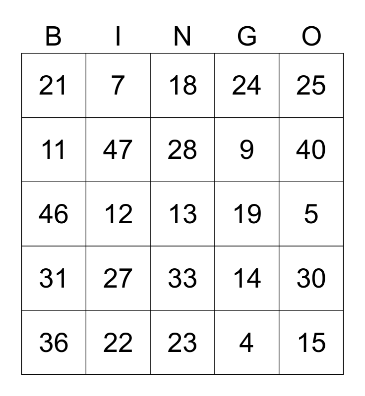 This bingo card has a free space and 49 words: 1, 2, 3, 4, 5, 6, 7, 8, 9, 10, 11, 12, 14, 15, 16, 17, 18, 19, 20, 21, 22, 23, 24, 25, 26, 27, 28, 29, 30, 31, 32, 33, 34, 35, 36, 37, 38, 39, 40, 41, 42, 43, 44, 45, 46, 47, 48, 49 and 50.