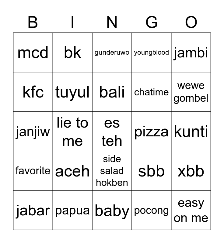 This bingo card has a free space and 24 words: aceh, papua, bali, jabar, jambi, mcd, kfc, bk, pizza, side salad hokben, chatime, janjiw, sbb, xbb, tuyul, pocong, kunti, gunderuwo, wewe gombel, lie to me, easy on me, favorite, youngblood and baby.