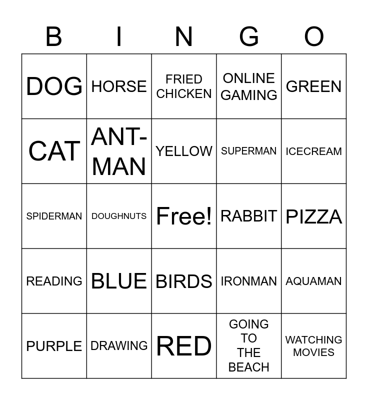This bingo card has a free space and 25 words: BLUE, RED, YELLOW, PURPLE, GREEN, DOG, CAT, HORSE, RABBIT, BIRDS, SUPERMAN, SPIDERMAN, IRONMAN, AQUAMAN, ANT-MAN, HAMBURGER, PIZZA, FRIED CHICKEN, ICECREAM, DOUGHNUTS, WATCHING MOVIES, DRAWING, READING, ONLINE GAMING and GOING TO THE BEACH.