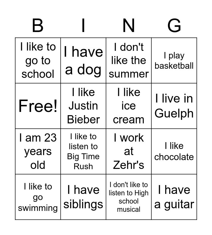 This bingo card has 16 words: I have siblings, I like chocolate, I don't like the summer, I like to go to school, I am 23 years old, I have a dog, I work at Zehr's, I don't like to listen to High school musical, Free!, I like Justin Bieber, I like to go swimming, I play basketball, I like to listen to Big Time Rush, I live in Guelph, I like ice cream and I have a guitar.