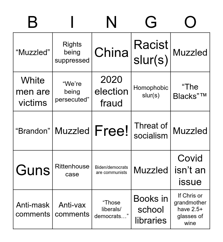 This bingo card has a free space and 28 words: Covid isn’t an issue, “The Gays”™, Homophobic slur(s), Books in school libraries, White men are victims, China, Rights being suppressed, Guns, Threat of socialism, Anti-mask comments, “Brandon”, Racist slur(s), Anti-vax comments, “Those liberals/ democrats…”, “The Blacks”™, Covid/vaccine misinformation, Rittenhouse case, “We’re being persecuted”, 2020 election fraud, Biden/democrats are communists, “Muzzled”, “Loudoun county’s (insert government title here)…”, If Chris or grandmother have 2.5+ glasses of wine, Muzzled, Muzzled, Muzzled, Muzzled and Muzzled.