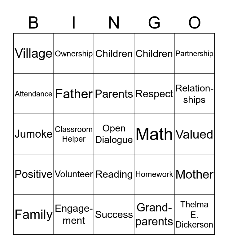 This bingo card has a free space and 24 words: Volunteer, Engage- ment, Parents, Family, Partnership, Village, Attendance, Ownership, Math, Reading, Respect, Jumoke, Homework, Mother, Father, Grand-parents, Valued, Children, Relation-ships, Classroom Helper, Thelma E. Dickerson, Positive, Children and Success.
