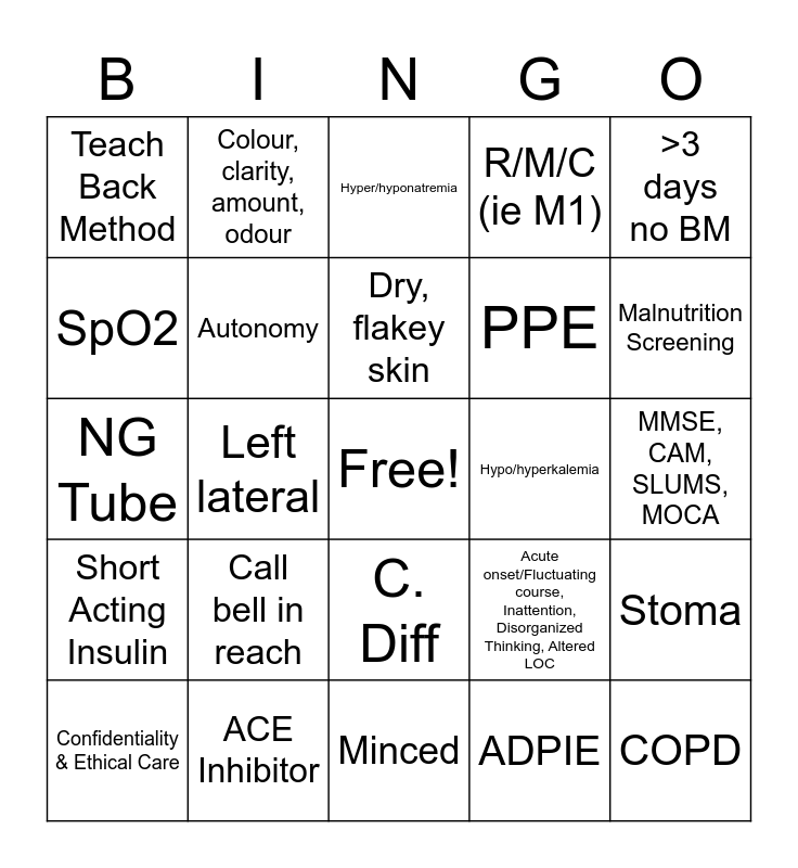This bingo card has a free space and 39 words: Friction & Shear, 2 Pt Identifiers, <4.0, Autonomy, Confidentiality & Ethical Care, C. Diff, Dry, flakey skin, Med Admin, >3 days no BM, Short Acting Insulin, Left lateral, R/M/C (ie M1), COPD, MMSE, CAM, SLUMS, MOCA, Hypo/hyperkalemia, Call bell in reach, Ventrogluteal, Teach Back Method, CBG, Acute onset/Fluctuating course, Inattention, Disorganized Thinking, Altered LOC, SpO2, Minced, PPE, Malnutrition Screening, Catheter Insertion, Dressing Change, Fluid Balance, Risk of impaired skin integrity, Basal, Colour, clarity, amount, odour, Redirecting a resident with dementia, >18.0, Hyper/hyponatremia, ACE Inhibitor, ADPIE, Head to Toe, Stoma, NG Tube and Bladder Scanner.