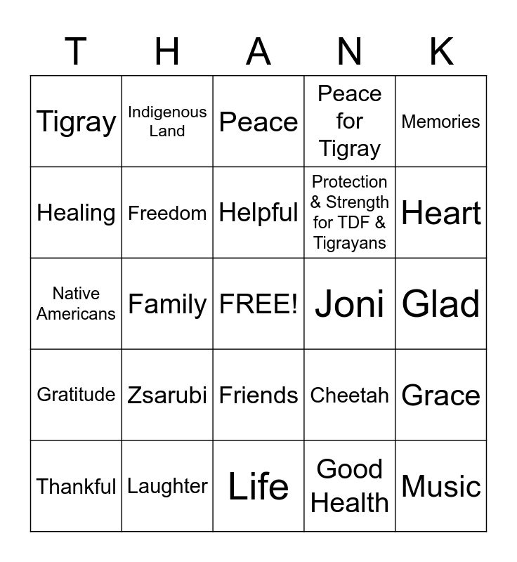 This bingo card has a free space and 29 words: Thankful, Love, Family, Joy, Tigray, Peace, Freedom, Zsarubi, Joni, Laughter, Glad, Music, Life, Good Health, Heart, Good Food, Friends, Gratitude, Memories, Native Americans, Cheetah, Earth, Protection & Strength for TDF & Tigrayans, Healing, Peace for Tigray, Indigenous Land, Grace, Helpful and Providence.