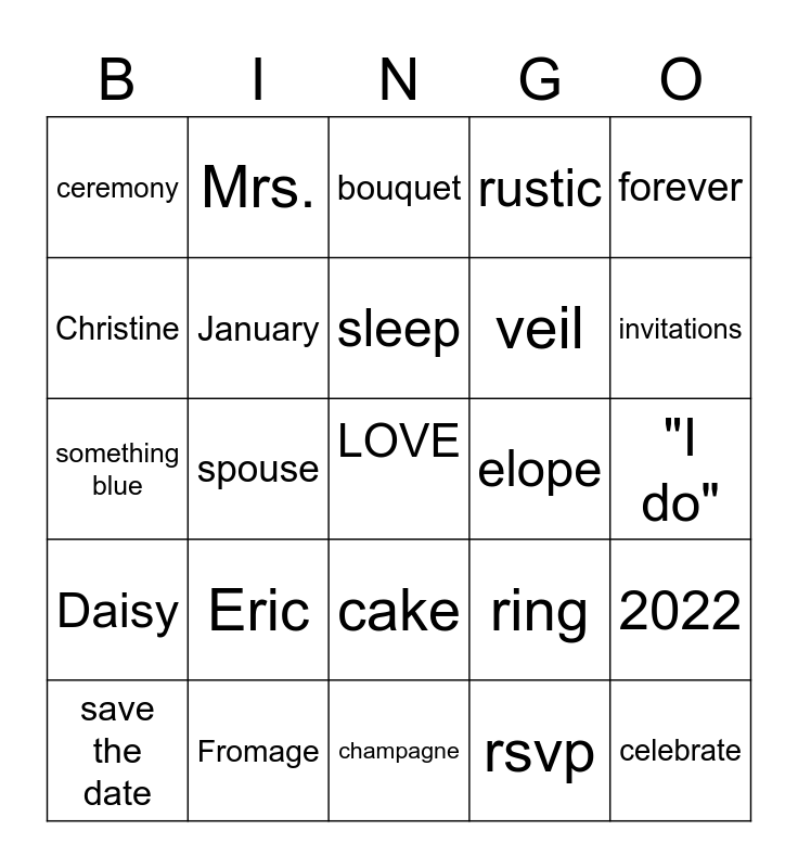This bingo card has a free space and 24 words: Eric, Fromage, sleep, save the date, forever, ceremony, Christine, Mrs., elope, cake, veil, something blue, ring, 2022, January, rsvp, "I do", bouquet, invitations, spouse, celebrate, Daisy, rustic and champagne.