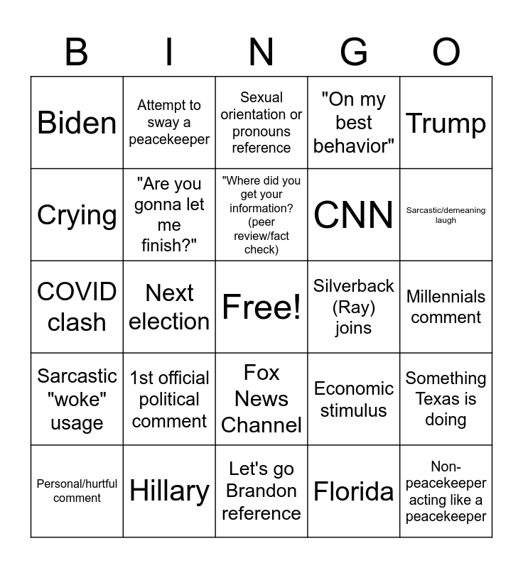 This bingo card has a free space and 25 words: 1st official political comment, Let's go Brandon reference, "Where did you get your information? (peer review/fact check), Personal/hurtful comment, Trump, Biden, Crying, Attempt to sway a peacekeeper, Silverback (Ray) joins, Fox News Channel, CNN, COVID clash, Economic stimulus, Something Texas is doing, "Are you gonna let me finish?", 1st instigating comment, Millennials comment, Sexual orientation or pronouns reference, Sarcastic/demeaning laugh, Next election, Non-peacekeeper acting like a peacekeeper, Hillary, Sarcastic "woke" usage, "On my best behavior" and Florida.