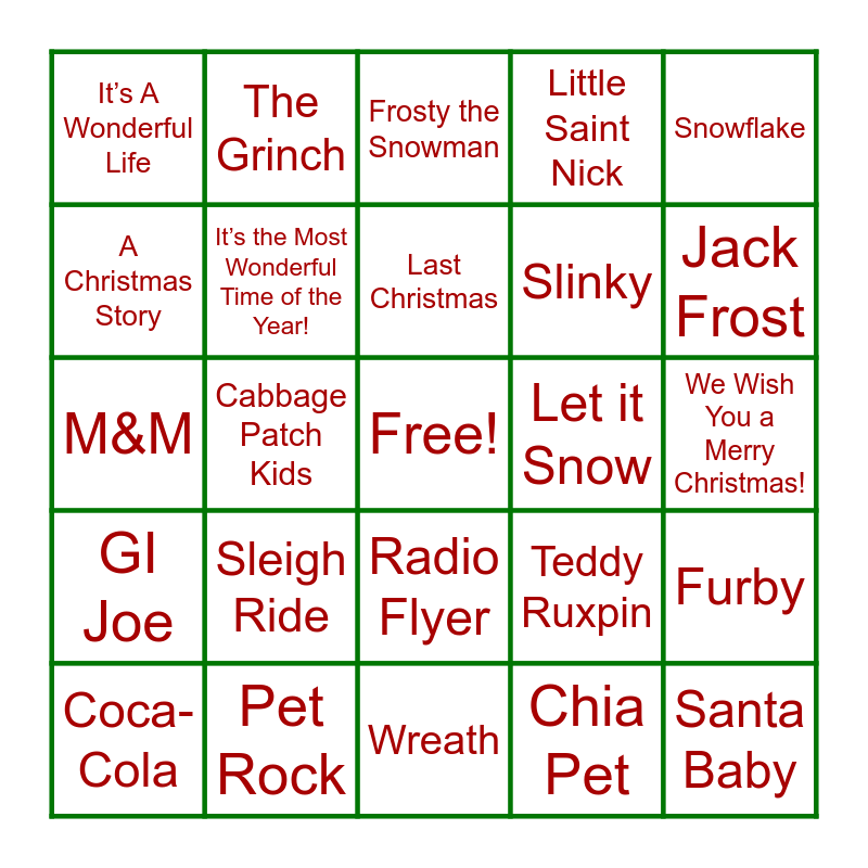 This bingo card has a free space and 79 words: Charlie Brown Christmas, Rudolf the Red-Nosed Reindeer, Frosty the Snowman, Jingle All the Way, Joy to the World!, Do You Hear What I Hear?, The Santa Clause, Feliz Navidad!, Elf, Have Yourself a Merry Little Christmas, A Nightmare Before Christmas, The Christmas Song, Little Saint Nick, It’s A Wonderful Life, Home Alone, A Christmas Story, Christmas Vacation, Sleigh Ride, Where are you Christmas?, We Wish You a Merry Christmas!, Hershey’s Kisses, Snowflake, M&M, Last Christmas, It’s the Most Wonderful Time of the Year!, Deck the Halls, Manger, Wizards of Winter, Star, All I Want for Christmas is You, Jack Frost, Rockin’ Around the Christmas Tree, Wreath, Jingle Bell Rock, Coca-Cola, Let it Snow, Norelco, Do They Know It’s Christmas, Prancer, Santa Baby, Miracle on 34th Street, Winter Wonderland, Scrooged, A Christmas Carol, White Christmas, The Grinch, The Christmas Chronicles, Blue Christmas, Christmas with the Cranks, Rubik’s Cube, Furby, Cabbage Patch Kids, Teddy Ruxpin, Tickle-Me-Elmo, Nintendo, Sony Walkman, Atari, Beanie Babies, Fruitcake, Radio Flyer, Slinky, Etch-a-Sketch, Nerfball, Easy Bake Oven, Baby Alive, Magic 8 Ball, Twister, Operation, Hot Wheels, GI Joe, Pet Rock, Barbie & Friends, Polar Express, Mistletoe, Little Drummer Boy, Chia Pet, All I Want for Christmas is My Two Front Teeth, Campbell's Soup and Budweiser Clydesdales.