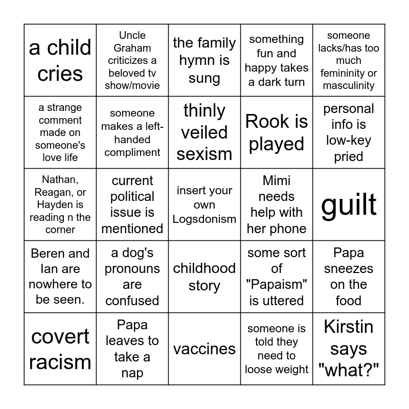 This bingo card has a free space and 24 words: covert racism, a dog's pronouns are confused, thinly veiled sexism, someone is told they need to loose weight, someone lacks/has too much femininity or masculinity, a child cries, Uncle Graham criticizes a beloved tv show/movie, the family hymn is sung, Mimi needs help with her phone, guilt, Nathan, Reagan, or Hayden is reading n the corner, someone makes a left-handed compliment, some sort of "Papaism" is uttered, Papa sneezes on the food, a strange comment made on someone's love life, Papa leaves to take a nap, vaccines, something fun and happy takes a dark turn, personal info is low-key pried, Beren and Ian are nowhere to be seen., current political issue is mentioned, childhood story, Rook is played and Kirstin says "what?".