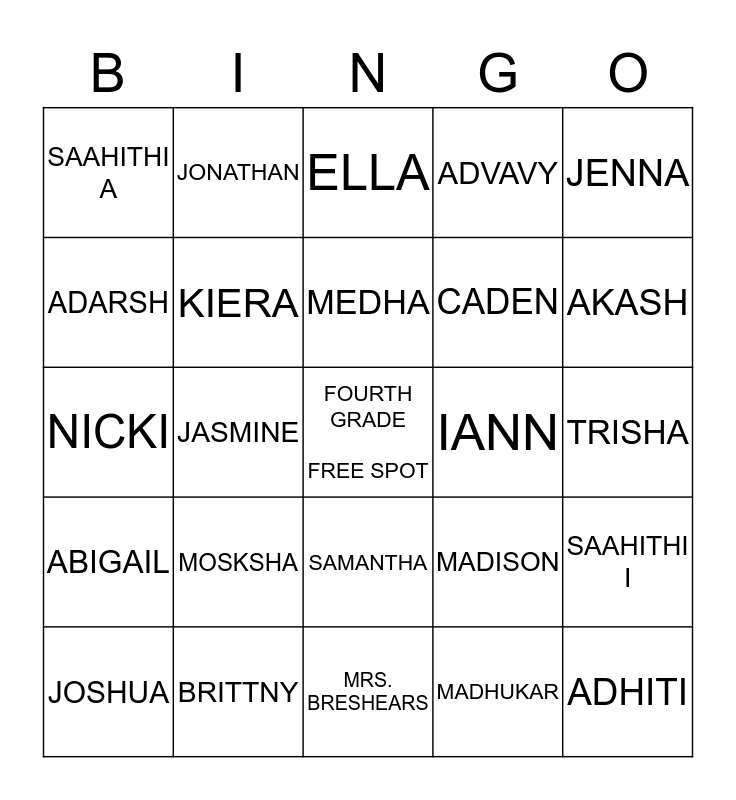 This bingo card has a free space and 24 words: MOSKSHA, BRITTNY, MEDHA, JOSHUA, JENNA, SAAHITHI A, ADARSH, JONATHAN, IANN, SAMANTHA, CADEN, NICKI, MADISON, SAAHITHI I, KIERA, MADHUKAR, TRISHA, ELLA, AKASH, JASMINE, ADHITI, ABIGAIL, ADVAVY and MRS. BRESHEARS.