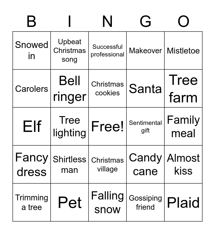 This bingo card has a free space and 25 words: Shirtless man, Falling snow, Christmas cookies, Trimming a tree, Mistletoe, Snowed in, Carolers, Upbeat Christmas song, Sentimental gift, Christmas village, Santa, Elf, Candy cane, Almost kiss, Bell ringer, Angel, Family meal, Successful professional, Tree farm, Tree lighting, Plaid, Pet, Fancy dress, Makeover and Gossiping friend.