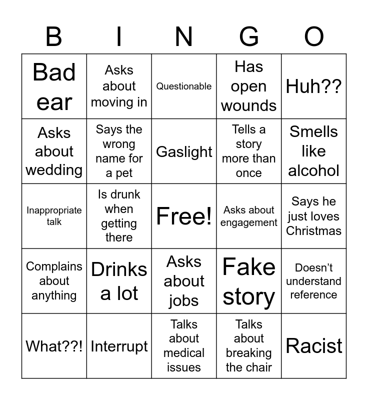 This bingo card has a free space and 24 words: Drinks a lot, Interrupt, Gaslight, What??!, Huh??, Bad ear, Asks about wedding, Asks about moving in, Asks about engagement, Asks about jobs, Tells a story more than once, Inappropriate talk, Fake story, Doesn’t understand reference, Says the wrong name for a pet, Talks about breaking the chair, Says he just loves Christmas, Questionable, Smells like alcohol, Is drunk when getting there, Racist, Complains about anything, Has open wounds and Talks about medical issues.