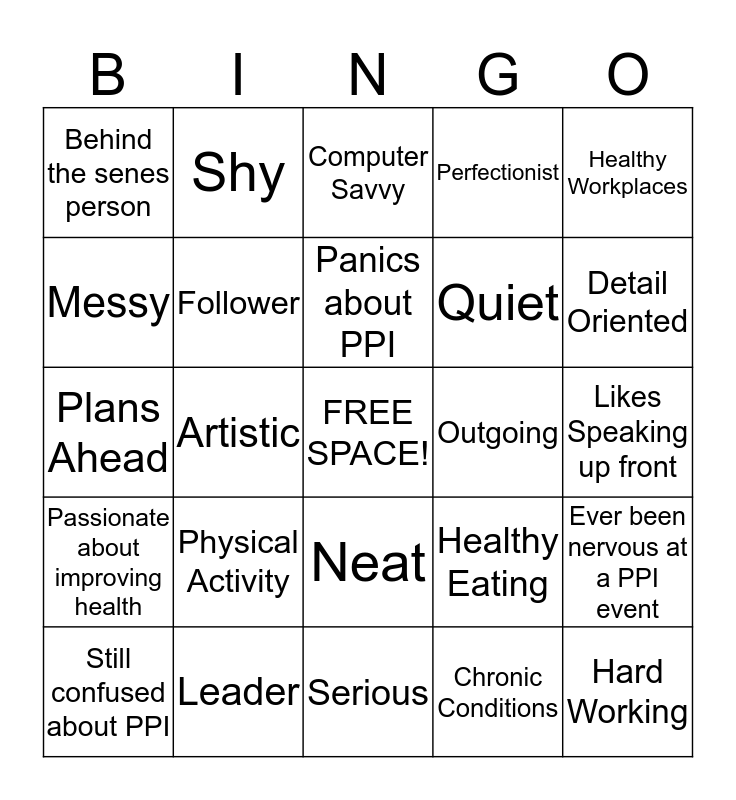 This bingo card has a free space and 24 words: Physical Activity, Leader, Panics about PPI, Still confused about PPI, Healthy Workplaces, Behind the senes person, Messy, Shy, Outgoing, Neat, Quiet, Plans Ahead, Healthy Eating, Ever been nervous at a PPI event, Follower, Chronic Conditions, Likes Speaking up front, Computer Savvy, Detail Oriented, Artistic, Hard Working, Passionate about improving health, Perfectionist and Serious.