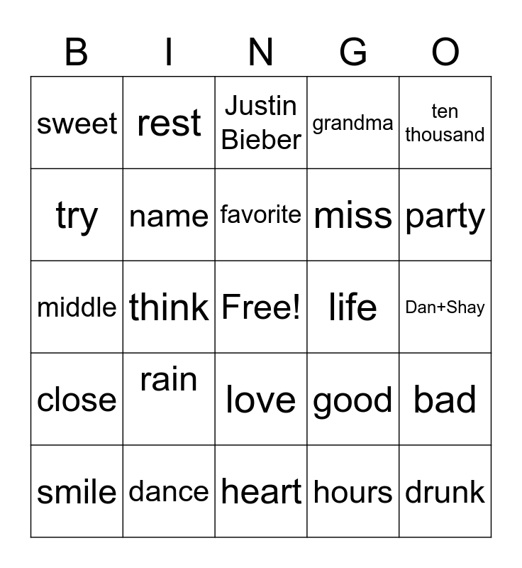 This bingo card has a free space and 24 words: rain, dance, favorite, smile, ten thousand, sweet, try, rest, life, love, miss, middle, good, bad, name, hours, Dan+Shay, Justin Bieber, party, think, drunk, close, grandma and heart.