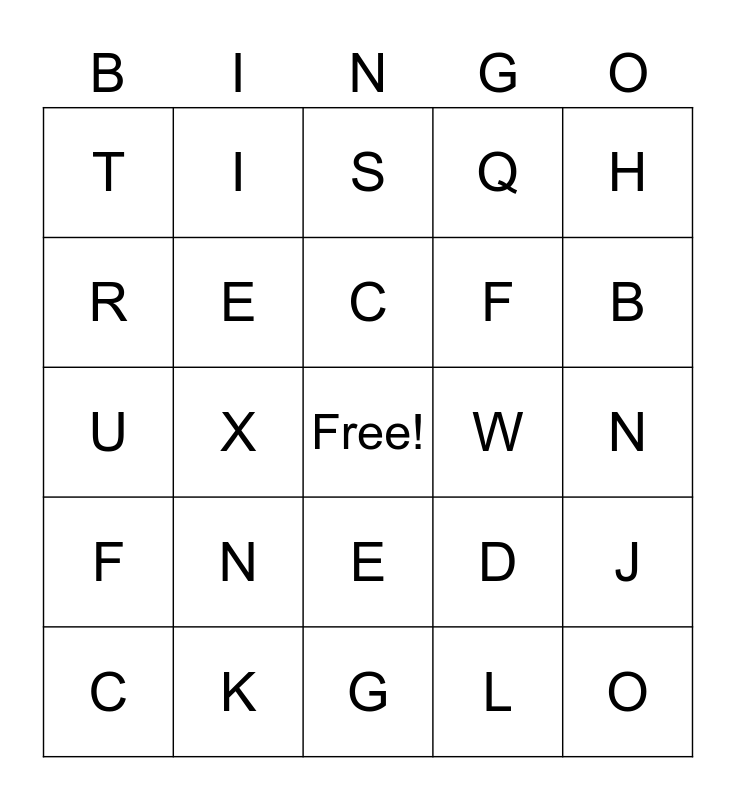 This bingo card has a free space and 48 words: A, O, K, G, N, M, I, B, R, V, E, Q, J, D, U, S, C, W, P, H, X, L, T, F, A, B, C, D, E, F, G, H, I, J, K, L, M, N, O, P, Q, R, S, T, U, V, W and X.