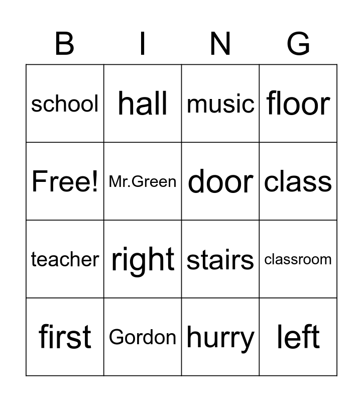 This bingo card has 16 words: Gordon, classroom, music, school, teacher, hall, stairs, hurry, Free!, Mr.Green, first, floor, right, class, door and left.