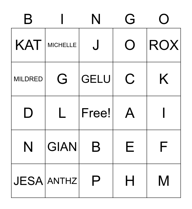 This bingo card has a free space and 24 words: GIAN, ANTHZ, GELU, JESA, ROX, KAT, MILDRED, MICHELLE, A, B, C, D, E, F, G, H, I, J, K, L, M, N, O and P.