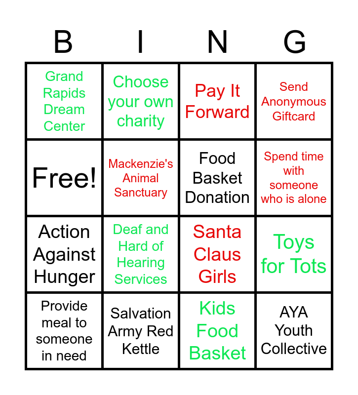 This bingo card has 16 words: Salvation Army Red Kettle, Toys for Tots, Pay It Forward, Grand Rapids Dream Center, Action Against Hunger, Choose your own charity, Santa Claus Girls, Kids Food Basket, Free!, Mackenzie's Animal Sanctuary, Provide meal to someone in need, Send Anonymous Giftcard, Deaf and Hard of Hearing Services, Spend time with someone who is alone, Food Basket Donation and AYA Youth Collective.
