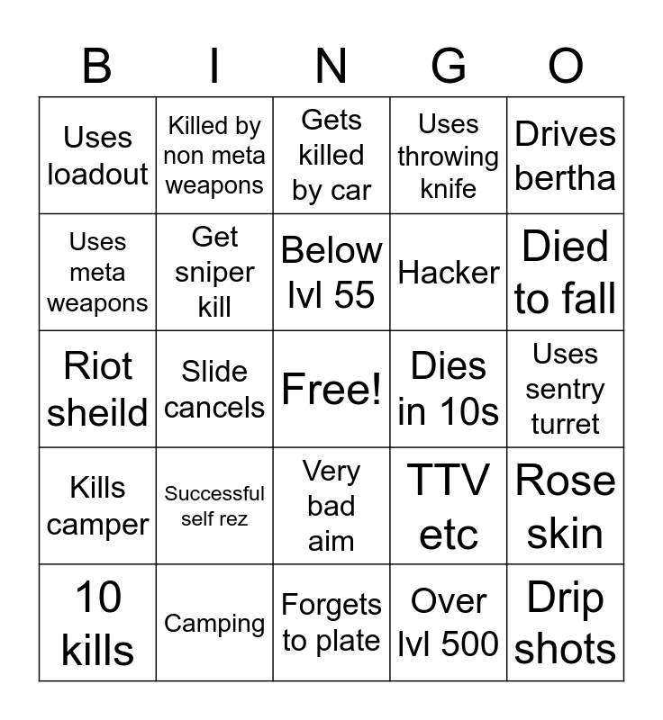 This bingo card has a free space and 24 words: Successful self rez, Camping, Below lvl 55, 10 kills, Drives bertha, Uses loadout, Uses meta weapons, Killed by non meta weapons, Dies in 10s, Very bad aim, Hacker, Riot sheild, TTV etc, Rose skin, Get sniper kill, Over lvl 500, Uses sentry turret, Gets killed by car, Died to fall, Slide cancels, Drip shots, Kills camper, Uses throwing knife and Forgets to plate.