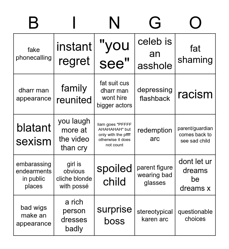 This bingo card has a free space and 24 words: bad wigs make an appearance, girl is obvious cliche blonde with possé, fat suit cus dharr man wont hire bigger actors, stereotypical karen arc, fat shaming, fake phonecalling, instant regret, "you see", redemption arc, parent/guardian comes back to see sad child, blatant sexism, family reunited, parent figure wearing bad glasses, dont let ur dreams be dreams x, dharr man appearance, a rich person dresses badly, surprise boss, celeb is an asshole, racism, embarassing endearments in public places, you laugh more at the video than cry, spoiled child, depressing flashback and questionable choices.