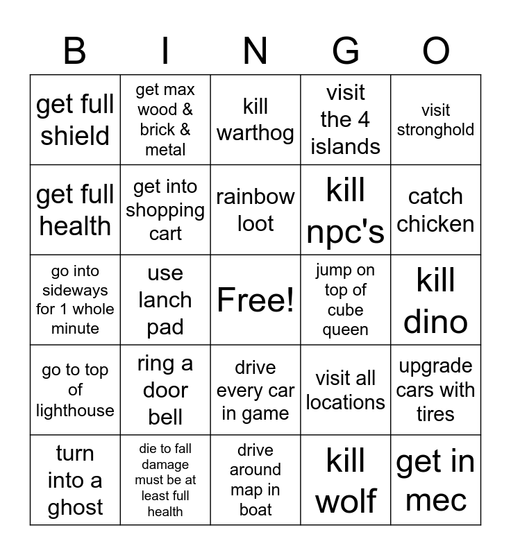 This bingo card has a free space and 24 words: ring a door bell, die to fall damage must be at least full health, rainbow loot, turn into a ghost, visit stronghold, get full shield, get full health, get max wood & brick & metal, jump on top of cube queen, drive every car in game, kill npc's, go into sideways for 1 whole minute, visit all locations, upgrade cars with tires, get into shopping cart, kill wolf, kill dino, kill warthog, catch chicken, use lanch pad, get in mec, go to top of lighthouse, visit the 4 islands and drive around map in boat.