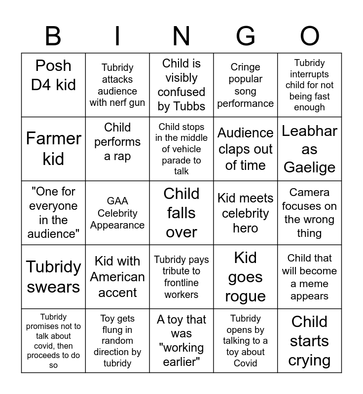 This bingo card has a free space and 24 words: Kid with American accent, Toy gets flung in random direction by tubridy, Child stops in the middle of vehicle parade to talk, Tubridy promises not to talk about covid, then proceeds to do so, Tubridy interrupts child for not being fast enough, Posh D4 kid, Farmer kid, Tubridy attacks audience with nerf gun, Kid meets celebrity hero, Tubridy pays tribute to frontline workers, Audience claps out of time, "One for everyone in the audience", Kid goes rogue, Child that will become a meme appears, Child performs a rap, Tubridy opens by talking to a toy about Covid, Camera focuses on the wrong thing, Child is visibly confused by Tubbs, Leabhar as Gaelige, GAA Celebrity Appearance, Child starts crying, Tubridy swears, Cringe popular song performance and A toy that was "working earlier".