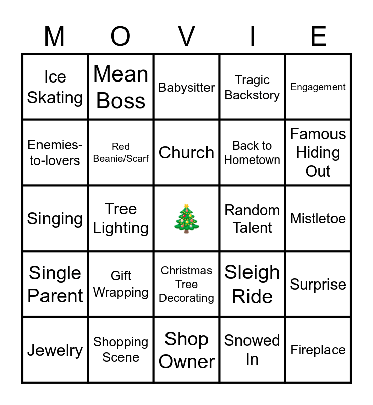 This bingo card has a free space and 54 words: Girlboss, Single Parent, Town Square, Christmas Themed Name, Christmas Tree Decorating, Token Diverse Friend, Tragic Backstory, Workaholic, Enemies-to-lovers, Hates Christmas, Ice Skating, Clumsy, Shopping Scene, Jewelry, Wealthy Character, Shop Owner, Fireplace, Back to Hometown, Moved to Small Town, Mistletoe, Sleigh Ride, Call of “Doom”, Random Talent, Engagement, Stranded, Mean Boss, Romantic Gesture, Bakery/Baking, Lodge, Snowed In, Road Trip, Mary/Joseph Character, Santa, Toxic Partner, Babysitter, Serenade, Singing, Surprise, Puppy/Kitty, Red Beanie/Scarf, Parade, Jingle Bell Rock, Childhood Friends, Fake Relationship, Gift Wrapping, First Snow Experience, Cute Kid, Rescue, Church, Tree Lighting, Famous Hiding Out, Wine/Cocktails, Flannel and Doesn’t Believe in Love.