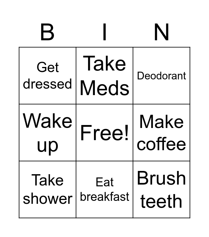 This bingo card has a free space and 8 words: Wake up, Take Meds, Make coffee, Take shower, Deodorant, Get dressed, Eat breakfast and Brush teeth.