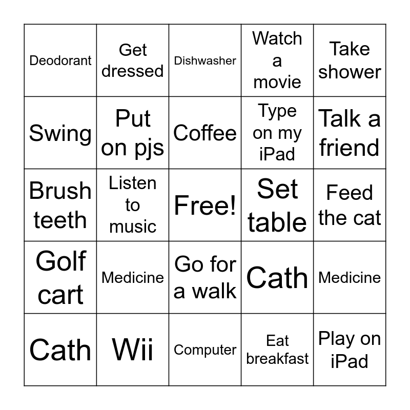 This bingo card has a free space and 24 words: Cath, Medicine, Coffee, Eat breakfast, Take shower, Deodorant, Get dressed, Dishwasher, Set table, Feed the cat, Brush teeth, Put on pjs, Cath, Medicine, Swing, Wii, Computer, Watch a movie, Talk a friend, Golf cart, Listen to music, Go for a walk, Type on my iPad and Play on iPad.