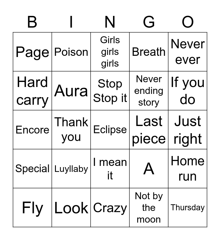 This bingo card has a free space and 24 words: Fly, Luyllaby, Stop Stop it, Not by the moon, Never ever, Page, Poison, Girls girls girls, Last piece, Just right, Encore, Aura, A, Home run, Hard carry, Look, Crazy, Breath, If you do, Special, Thank you, I mean it, Never ending story and Thursday.