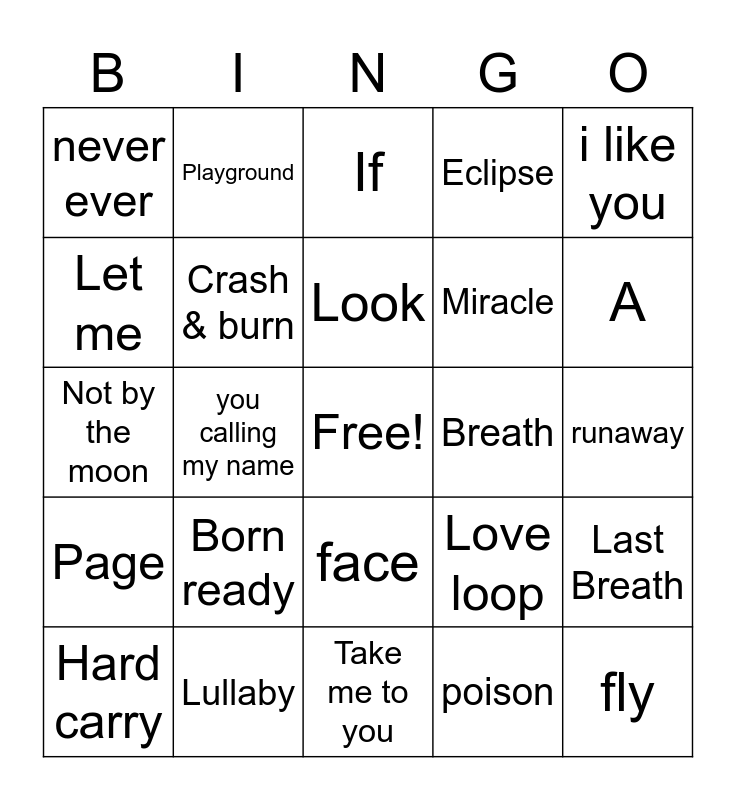 This bingo card has a free space and 27 words: Love loop, Girls Girls Girls, Miracle, Take me to you, Let me, If, Playground, Page, Breath, Last Breath, Not by the moon, Eclipse, Hard carry, Lullaby, A, Just right, Crash & burn, Look, Born ready, never ever, runaway, poison, you calling my name, fly, face, i like you and forever young.