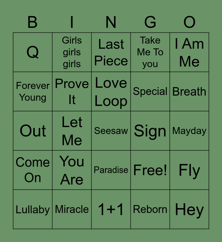 This bingo card has 25 words: You Are, 1+1, Love Loop, Lullaby, I Am Me, Q, Forever Young, Girls girls girls, Sign, Paradise, Special, Out, Free!, Fly, Prove It, Hey, Mayday, Last Piece, Breath, Let Me, Seesaw, Miracle, Come On, Take Me To you and Reborn.